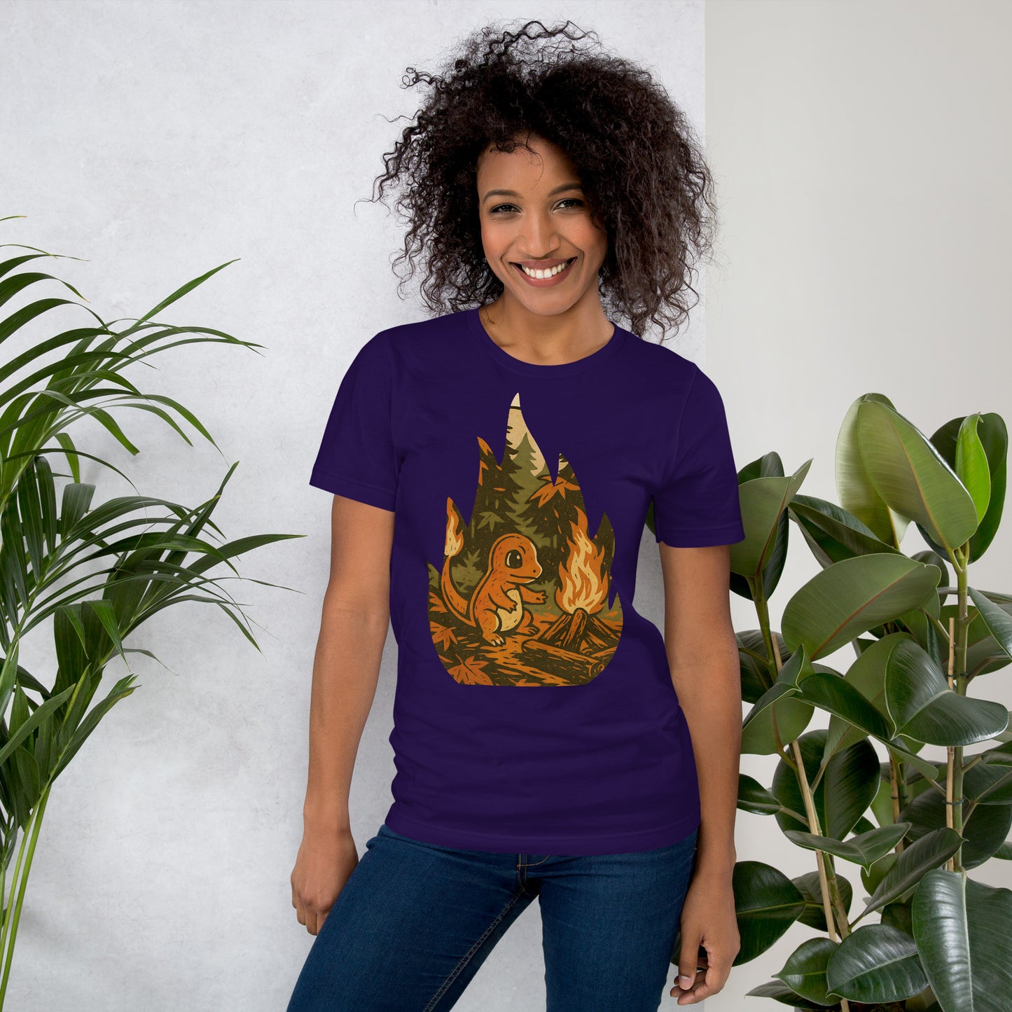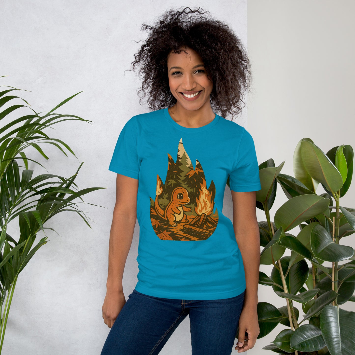 Cozy vibes, classic lore. This tee frames Charmander warming up by a campfire inside a flame-shaped silhouette—perfect for fans of the original Kanto adventures. In canon, Charmander is Pokédex #004, a Fire-type first partner Pokémon from Generation I. Its tail flame is more than a cute detail—it reflects the Pokémon’s life force, burning brighter when it’s healthy.