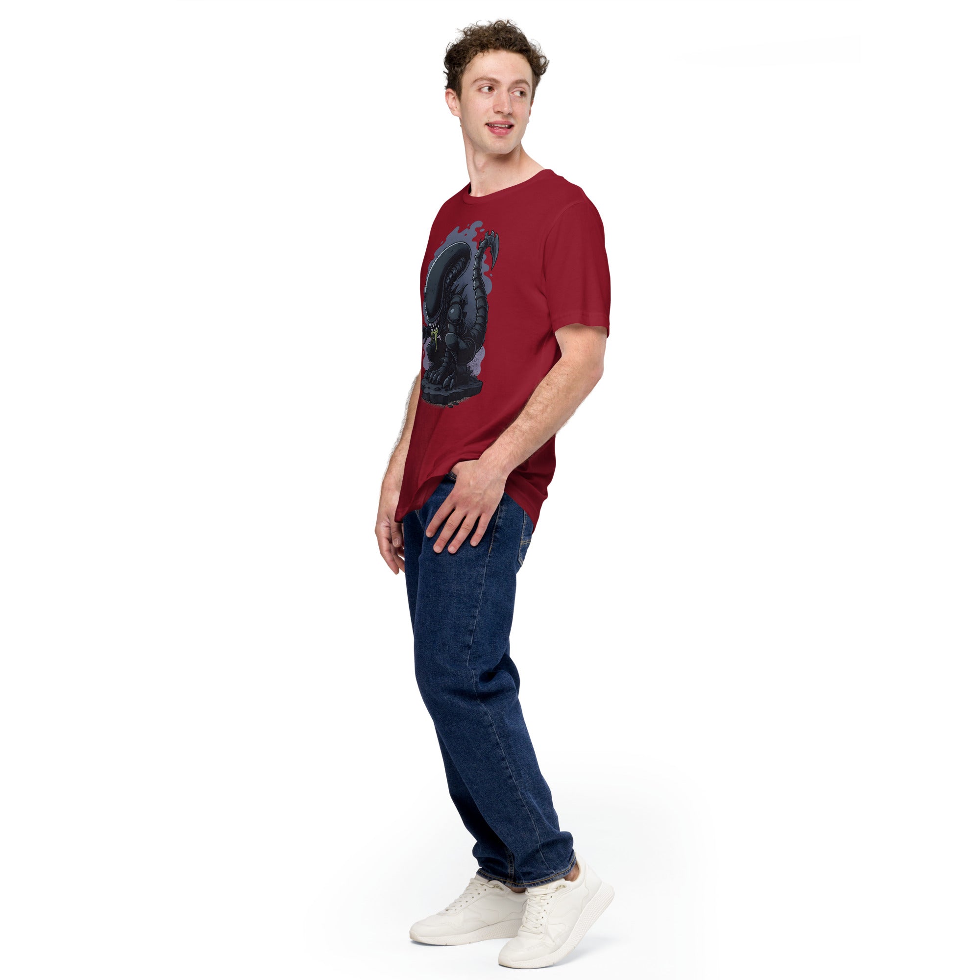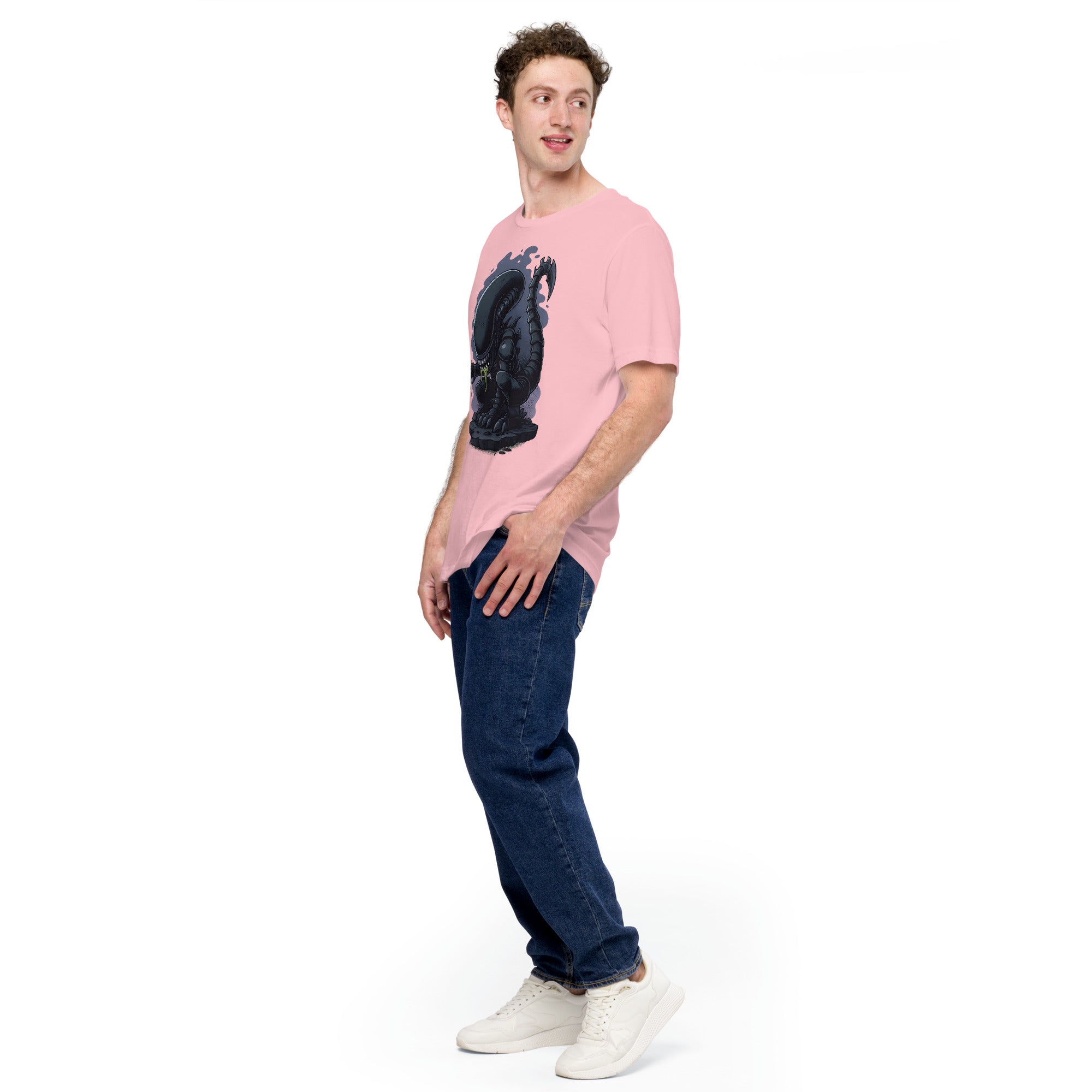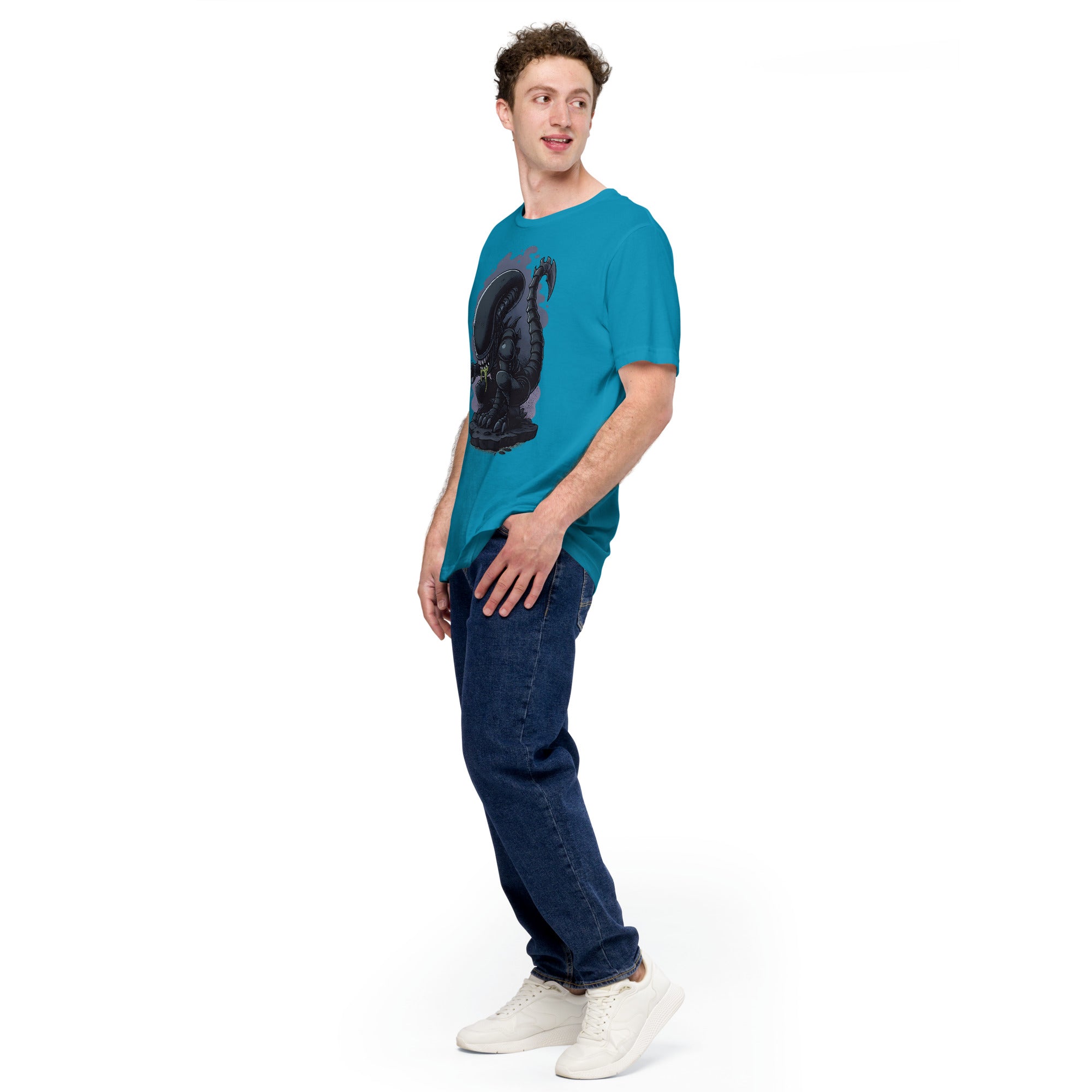 Bring a little cosmic terror to your fit—minus the jump scare. This tee features a **chibi xenomorph** crouched in a pool of inky shadows, its **sleek domed head**, **ribbed tail**, and **razor claws** rendered in glossy midnight tones. A tiny **inner-jaw grin** peeks from the mouth while neon drool drips from its fangs, turning a legendary sci-fi nightmare into a playful, wearable mascot.