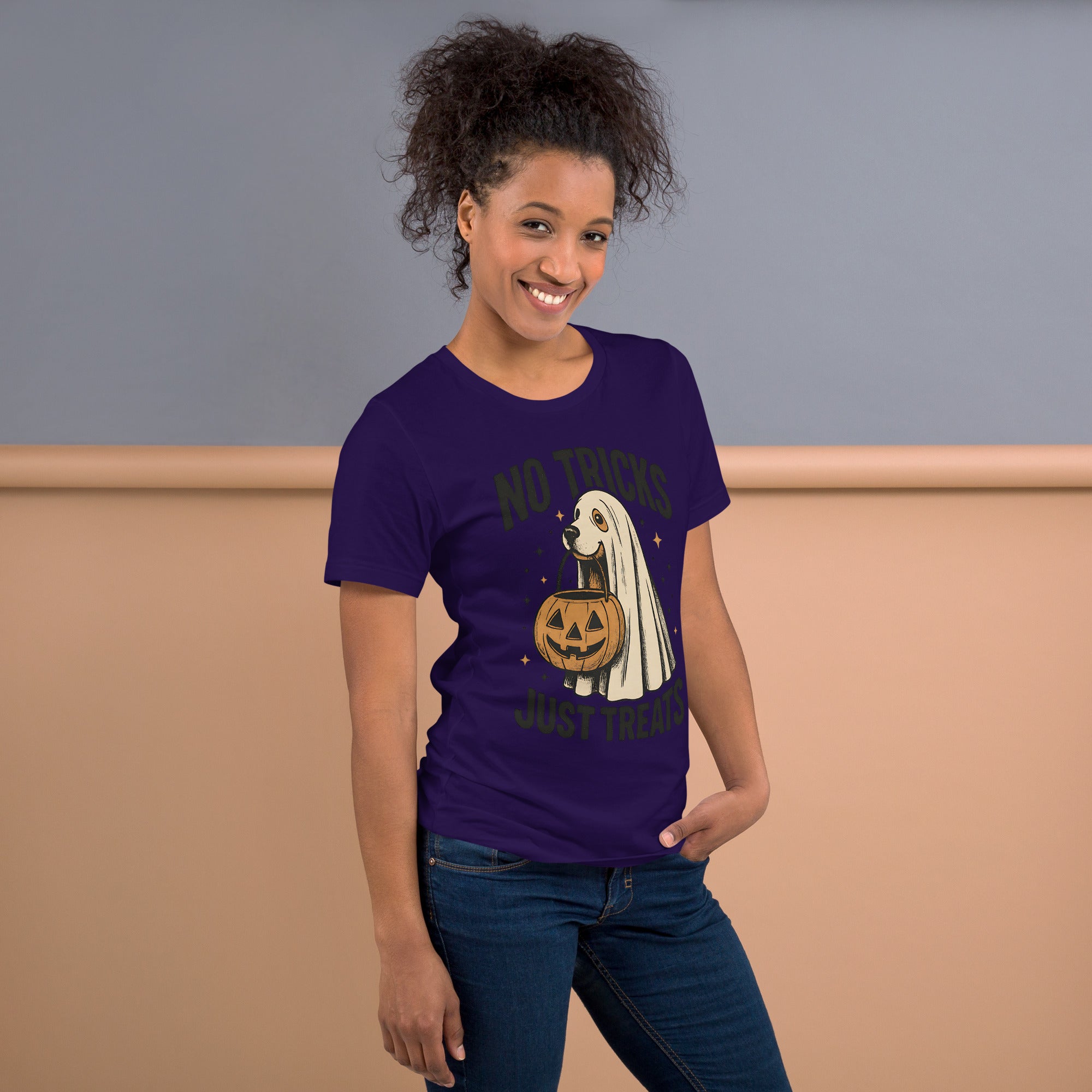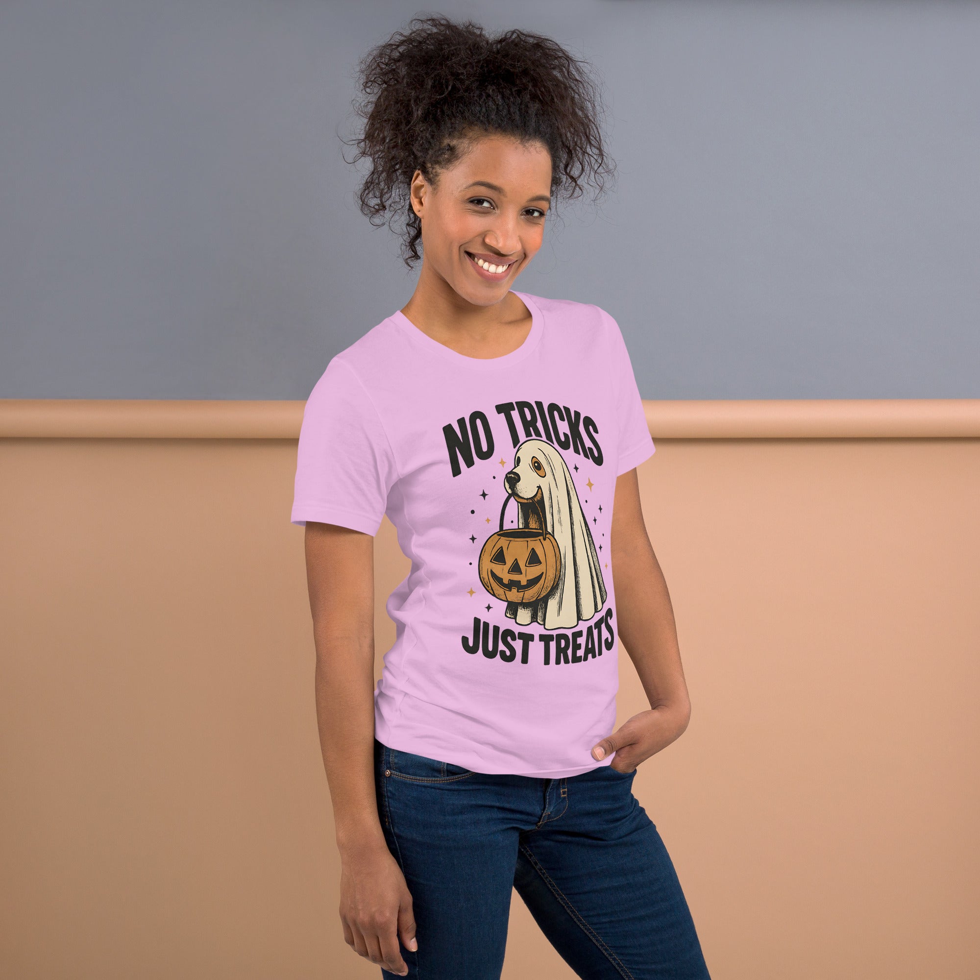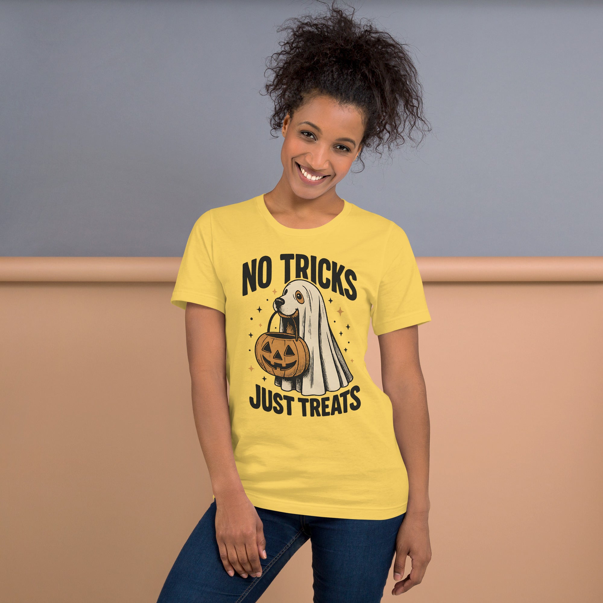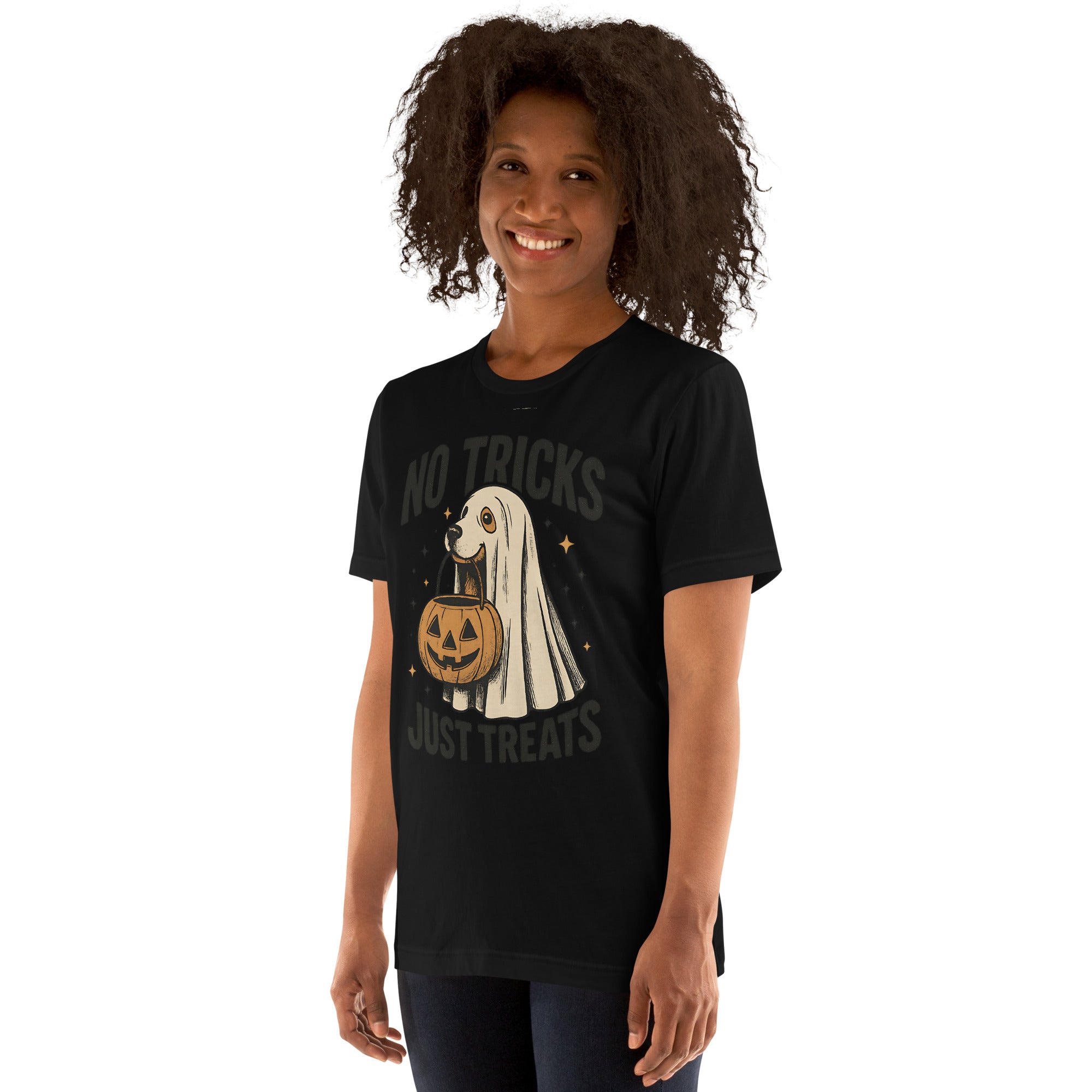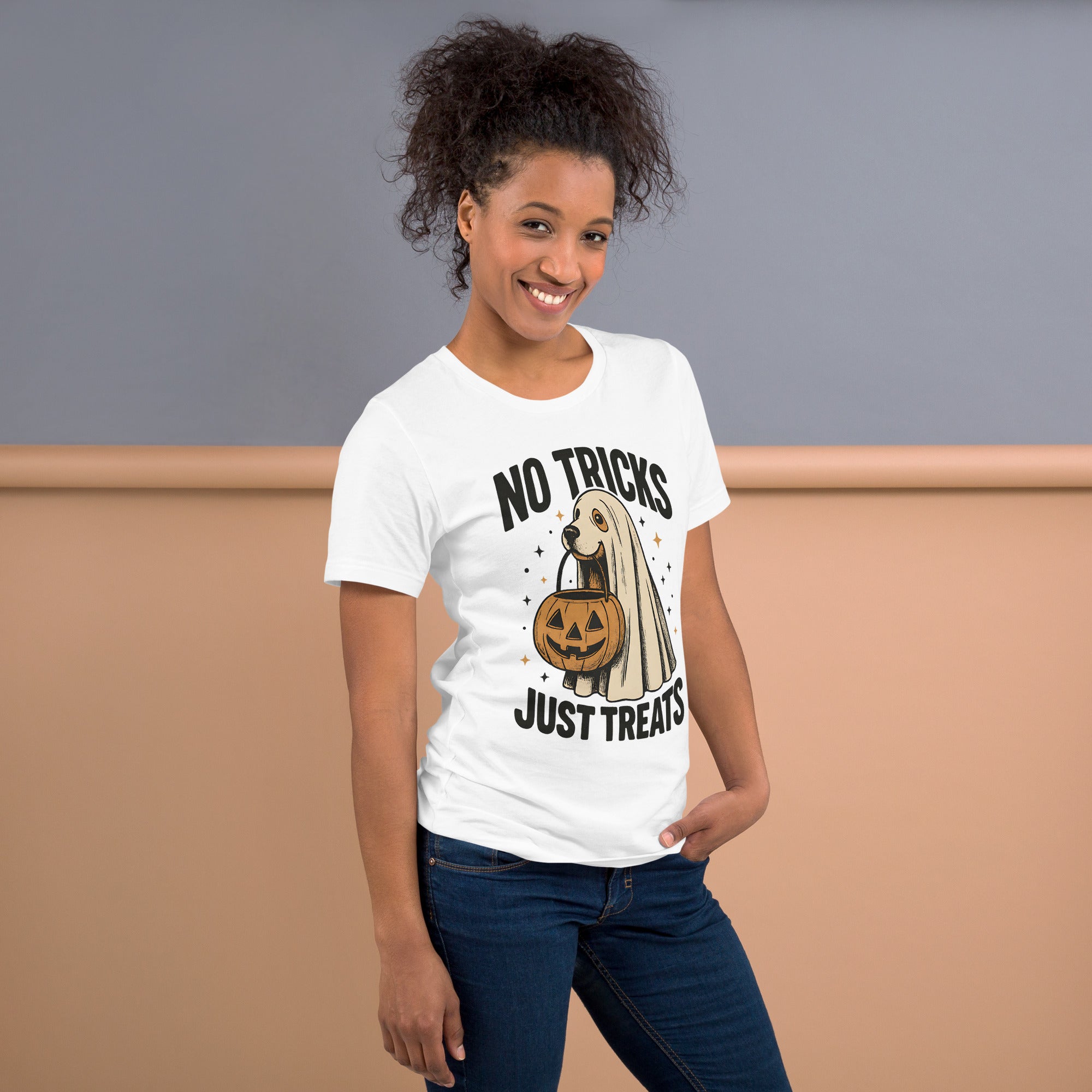 Bring on the sweets and the spooky-cute vibes. This playful graphic features a friendly dog dressed as a ghost, holding a smiling jack-o’-lantern candy bucket beneath the bold line: **“NO TRICKS JUST TREATS.”** Soft, rounded details and warm autumn tones make the design pop on a crisp white tee—perfect for pumpkin-patch trips, neighborhood candy runs, and October parties.