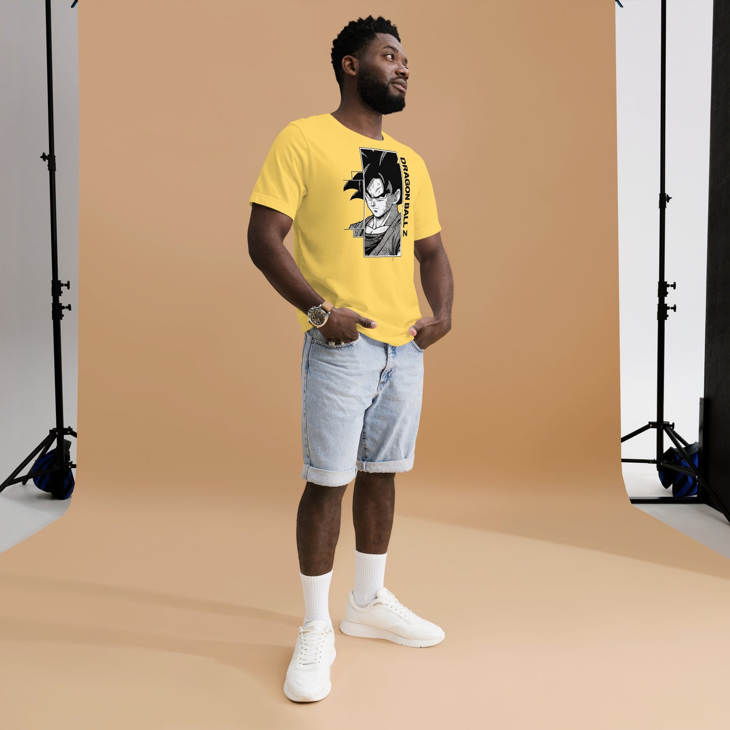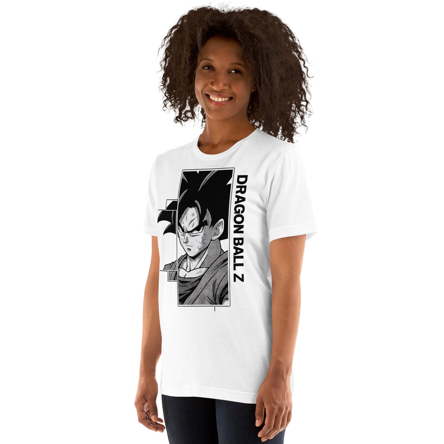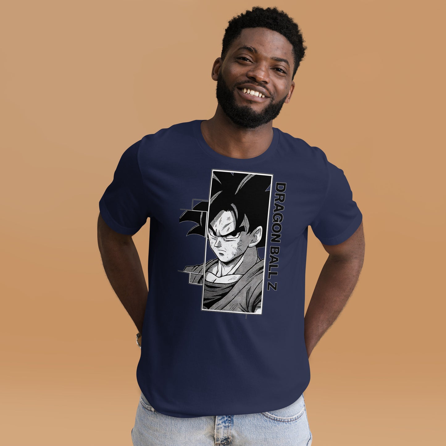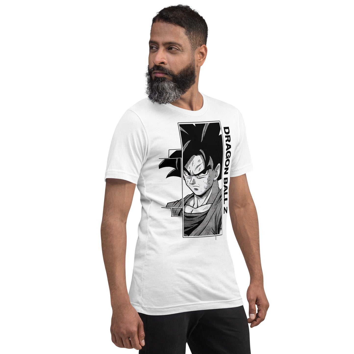 Fans will appreciate the subtle nods to his classic look (the series often pairs Goku with an orange uniform gifted by Kamesennin) while the monochrome art keeps the shirt sleek and easy to style.