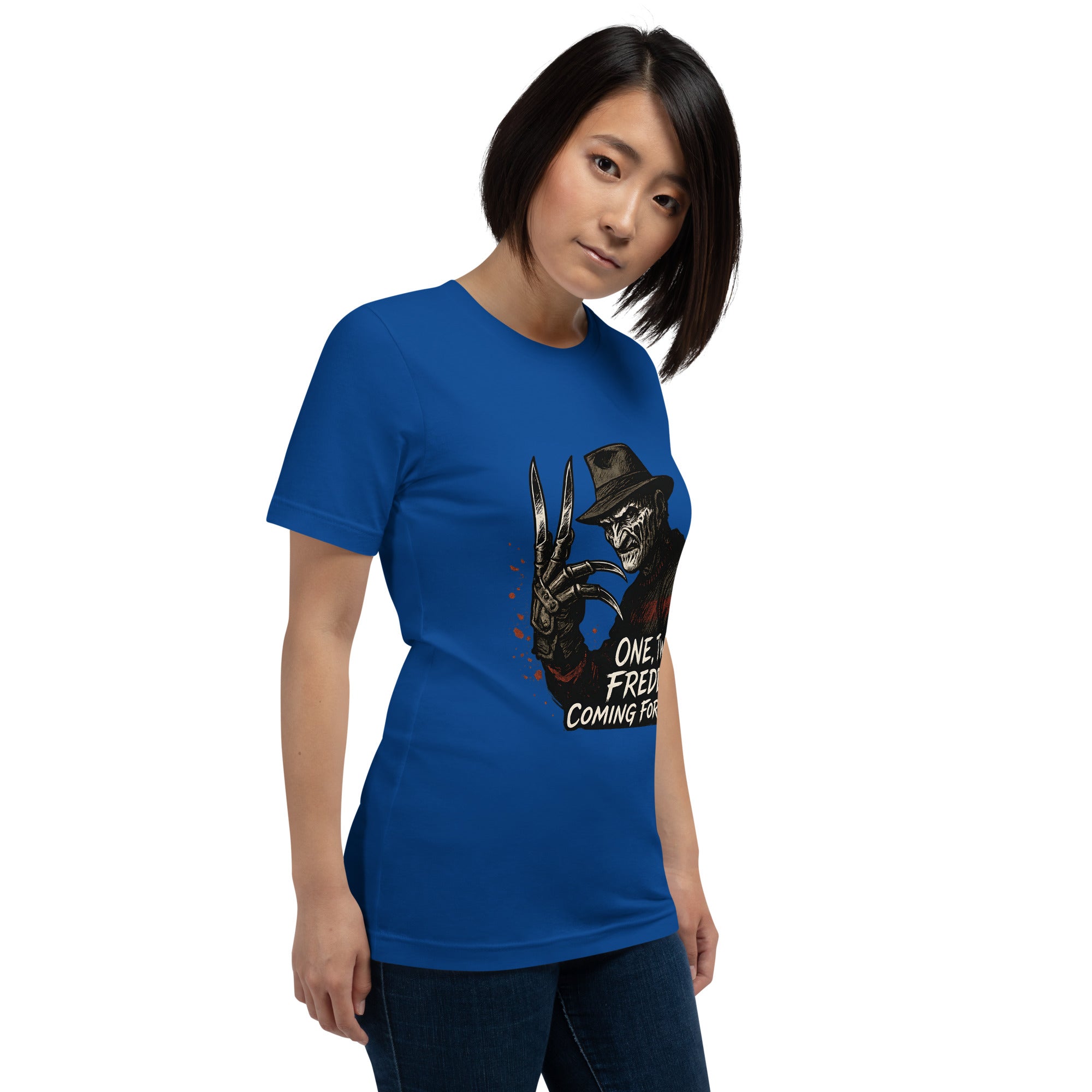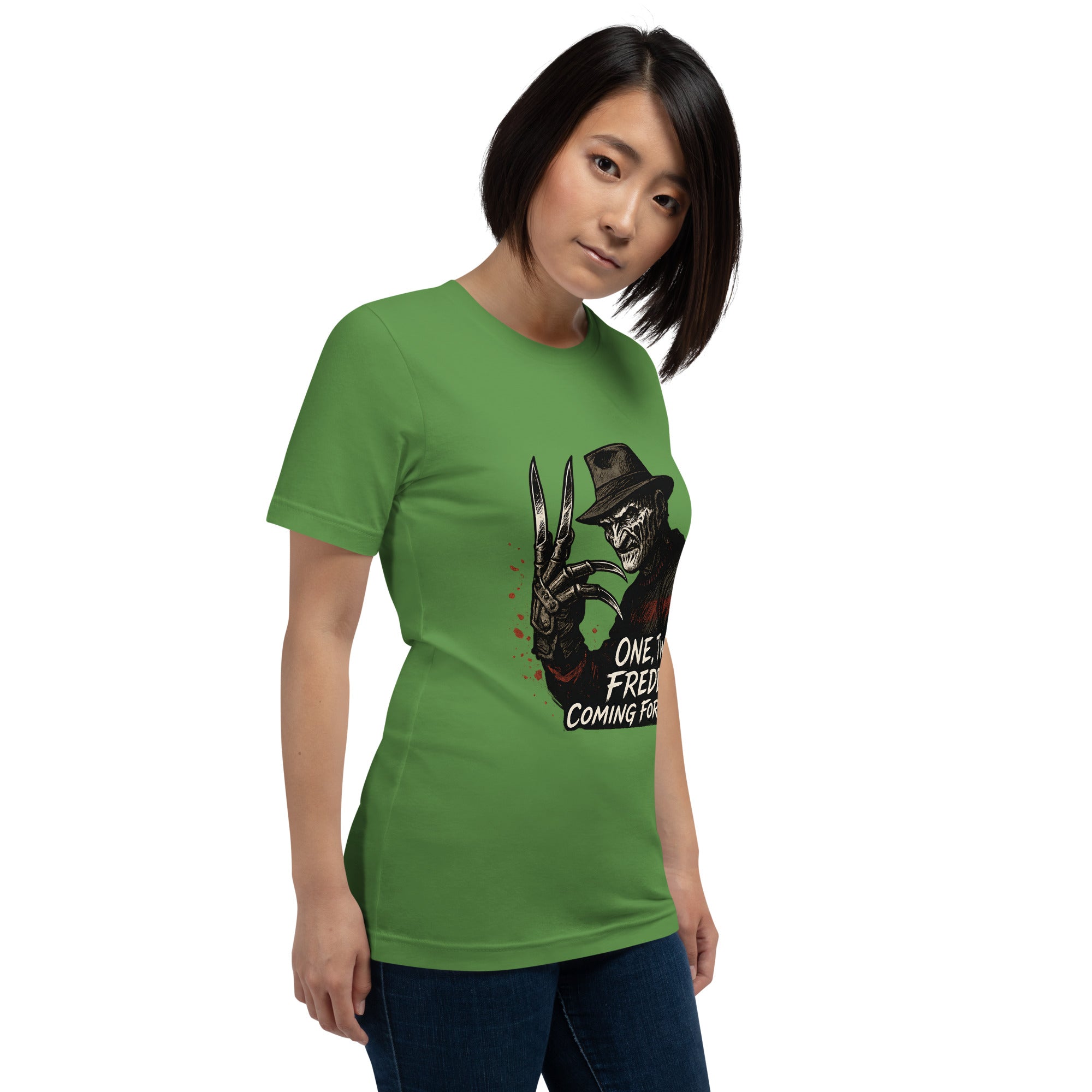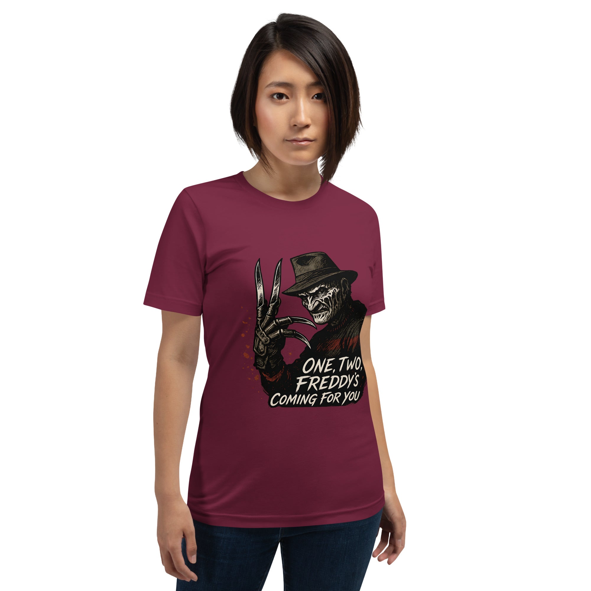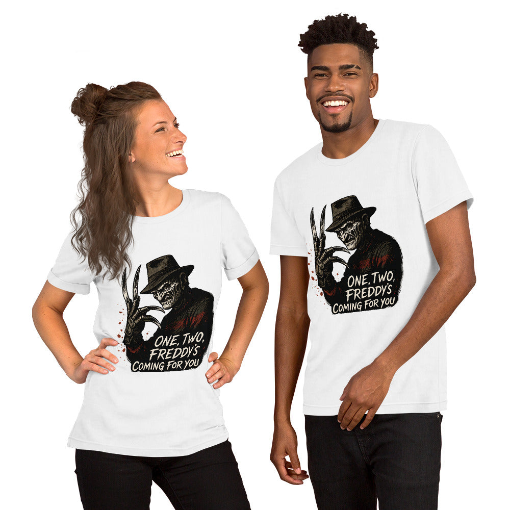 Slash into classic horror with a graphic of the razor-gloved dream stalker himself. This design features the burned face, brown fedora, and red-and-green striped sweater that define **Freddy Krueger**, paired with the chilling line: **“One, Two, Freddy’s Coming For You.”** Rendered in gritty detail, the art pops against the black fabric for a striking center-chest print that horror fans recognize instantly.