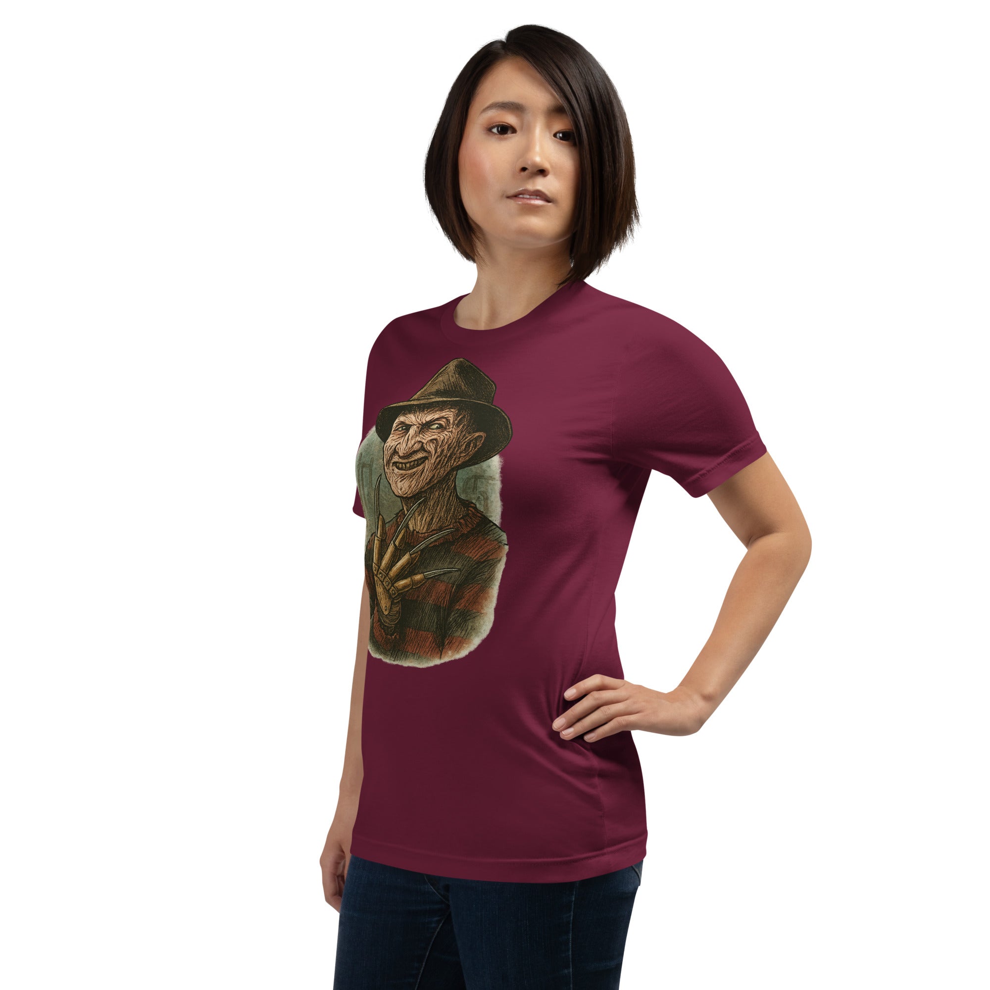Own a piece of slasher legend. This tee features a detailed portrait of the dream-stalking villain with his signature **brown fedora**, **tattered red-and-green striped sweater**, and **razor-clawed glove** raised in a menacing pose. Etched shading and vintage horror tones give the artwork a gritty, film-poster feel that pops on dark fabric.