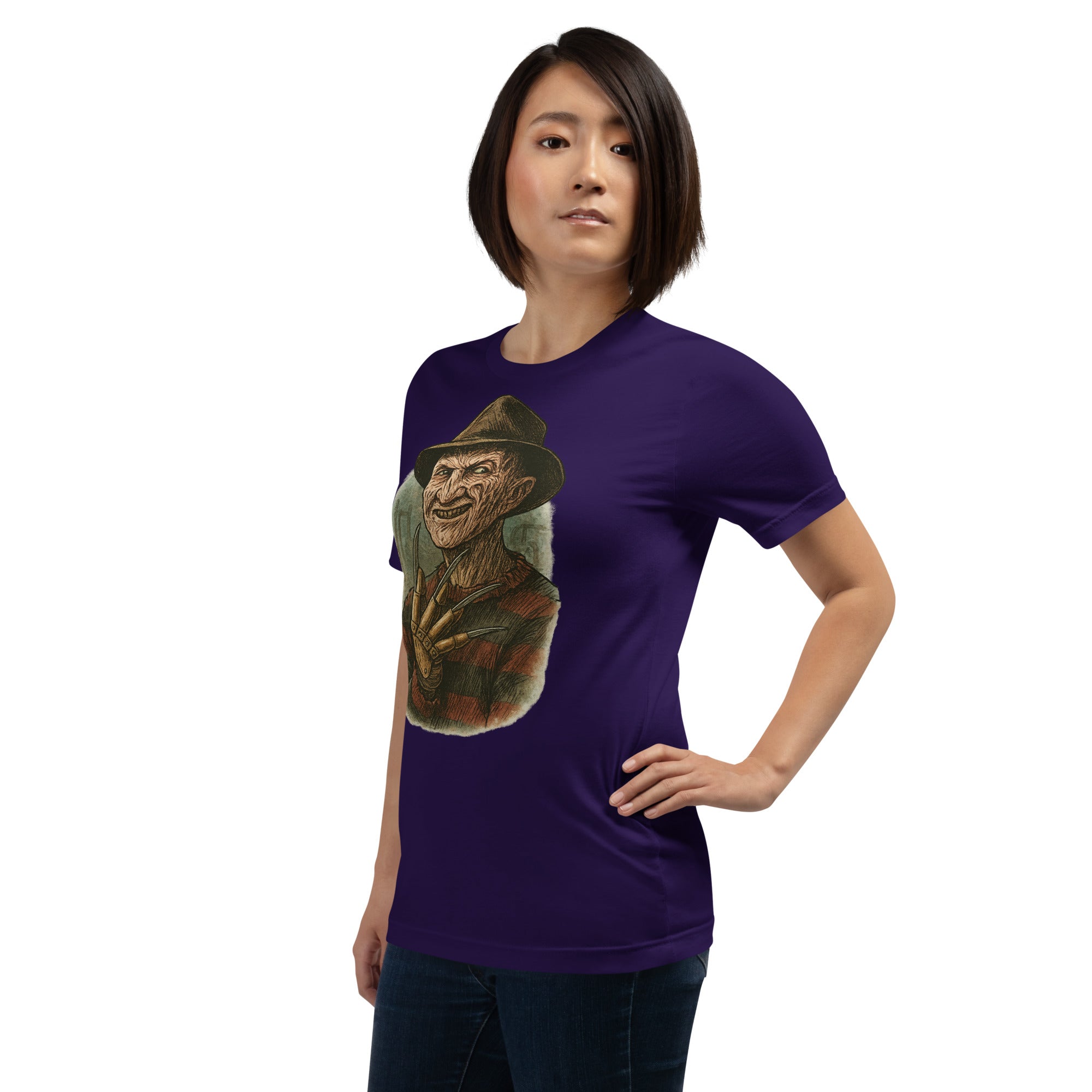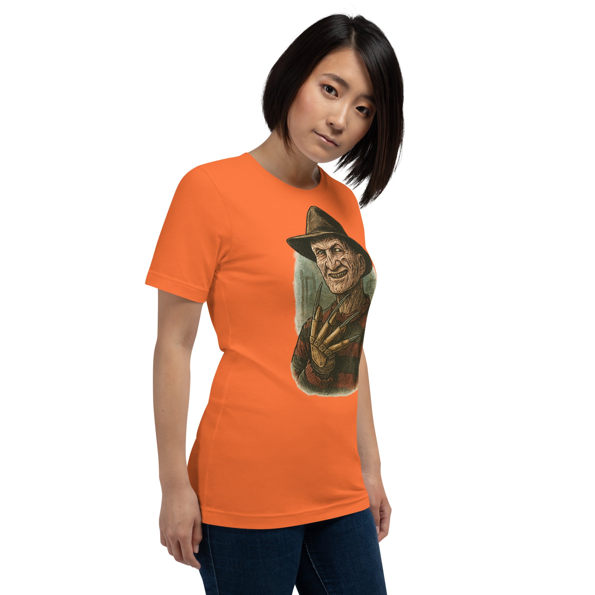 Built for everyday wear, the shirt uses soft, breathable material in a relaxed **unisex** fit—perfect for horror marathons, spooky-season outings, or year-round dark streetwear. High-fidelity printing preserves the crackled skin textures, sweater ribbing, and metallic sheen of the glove so the design stays bold after repeated washes.