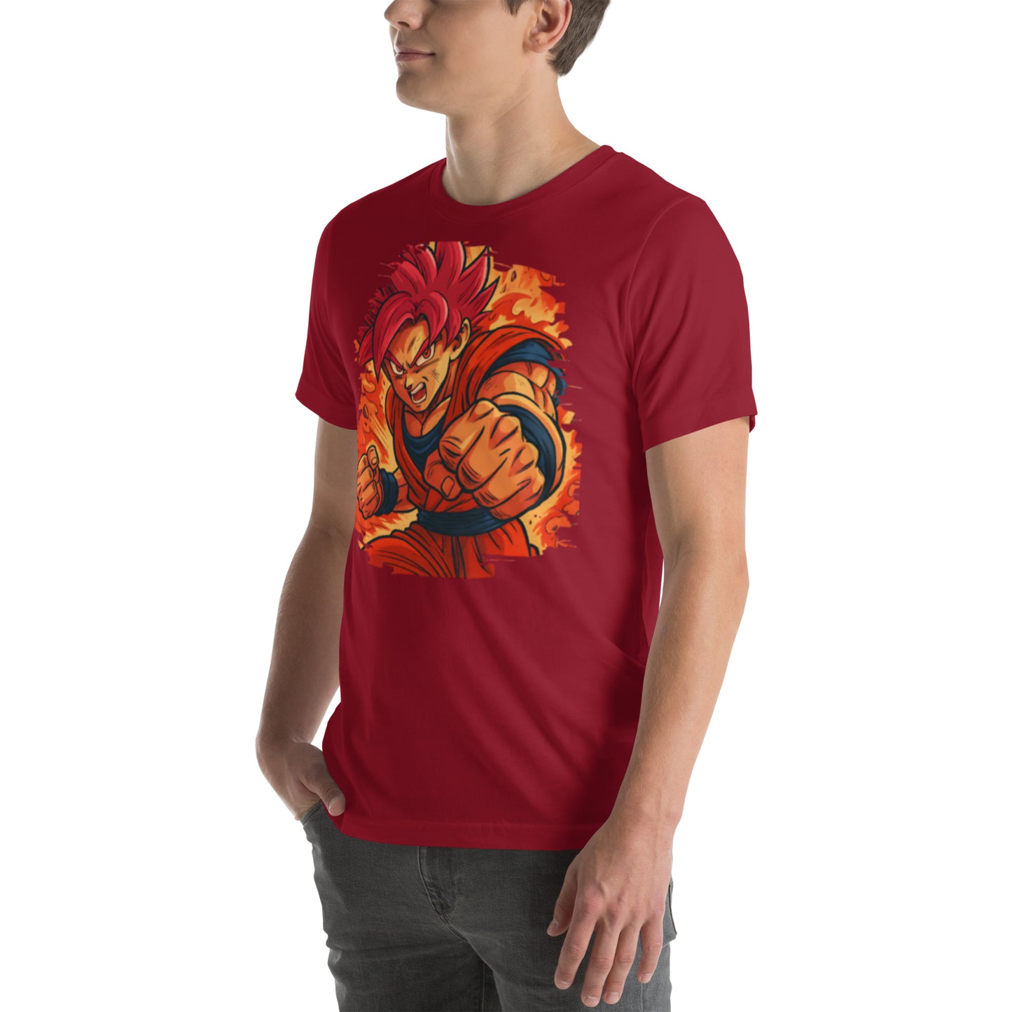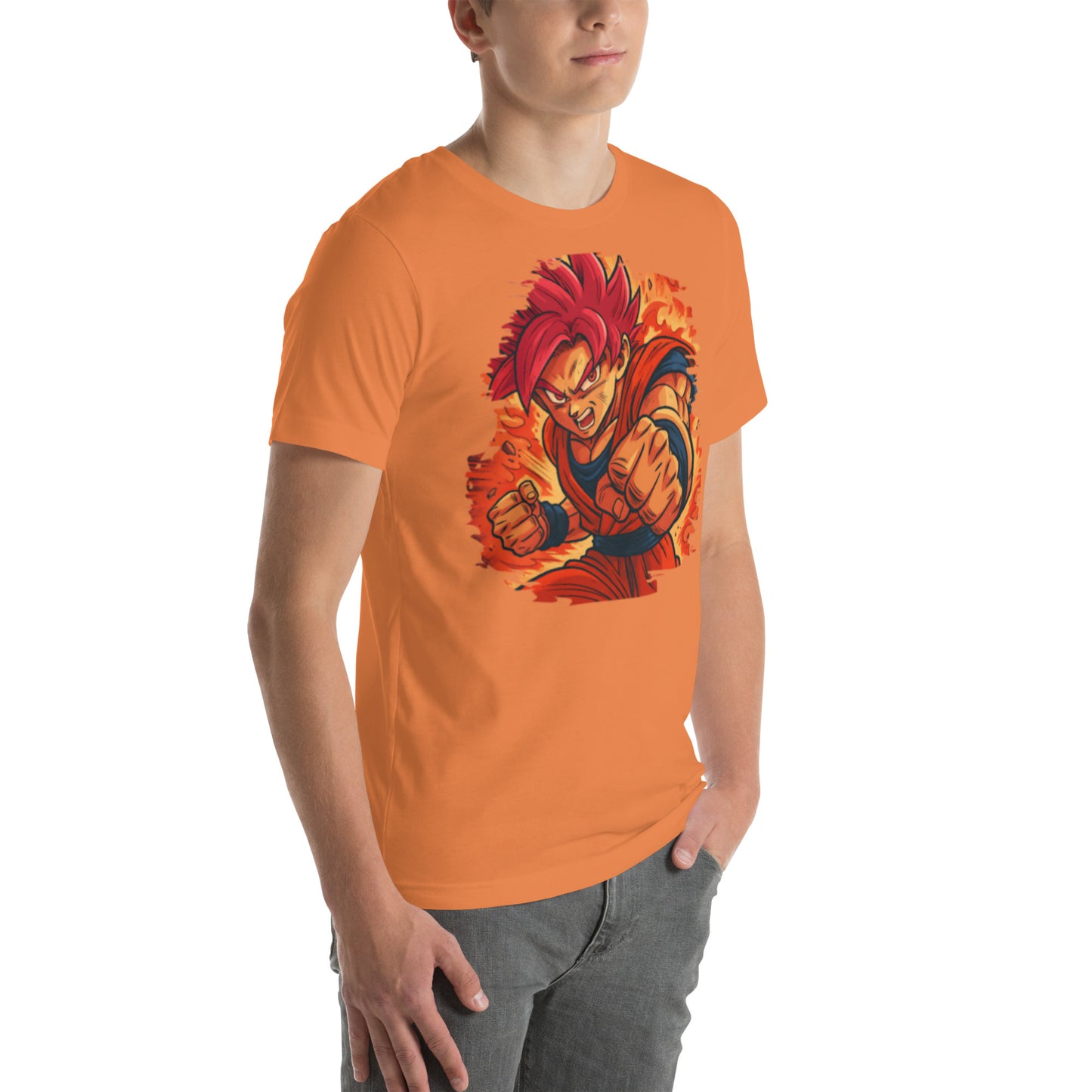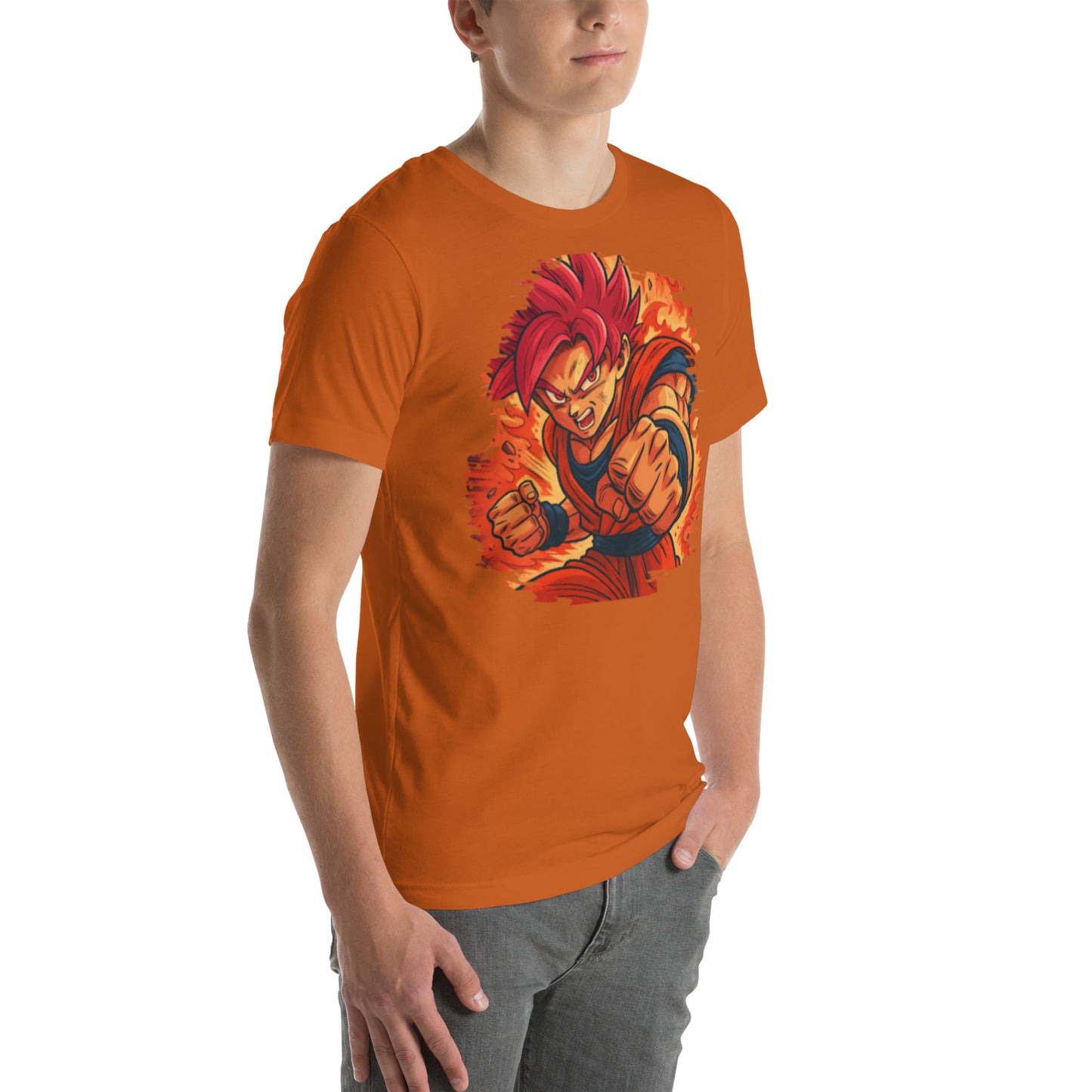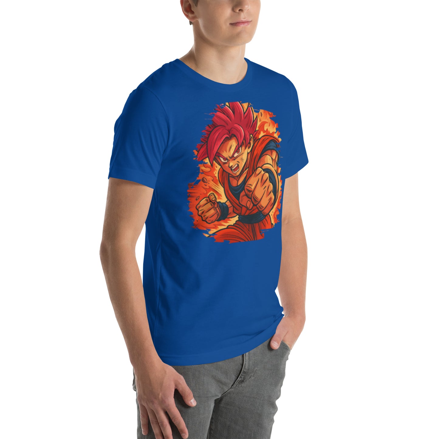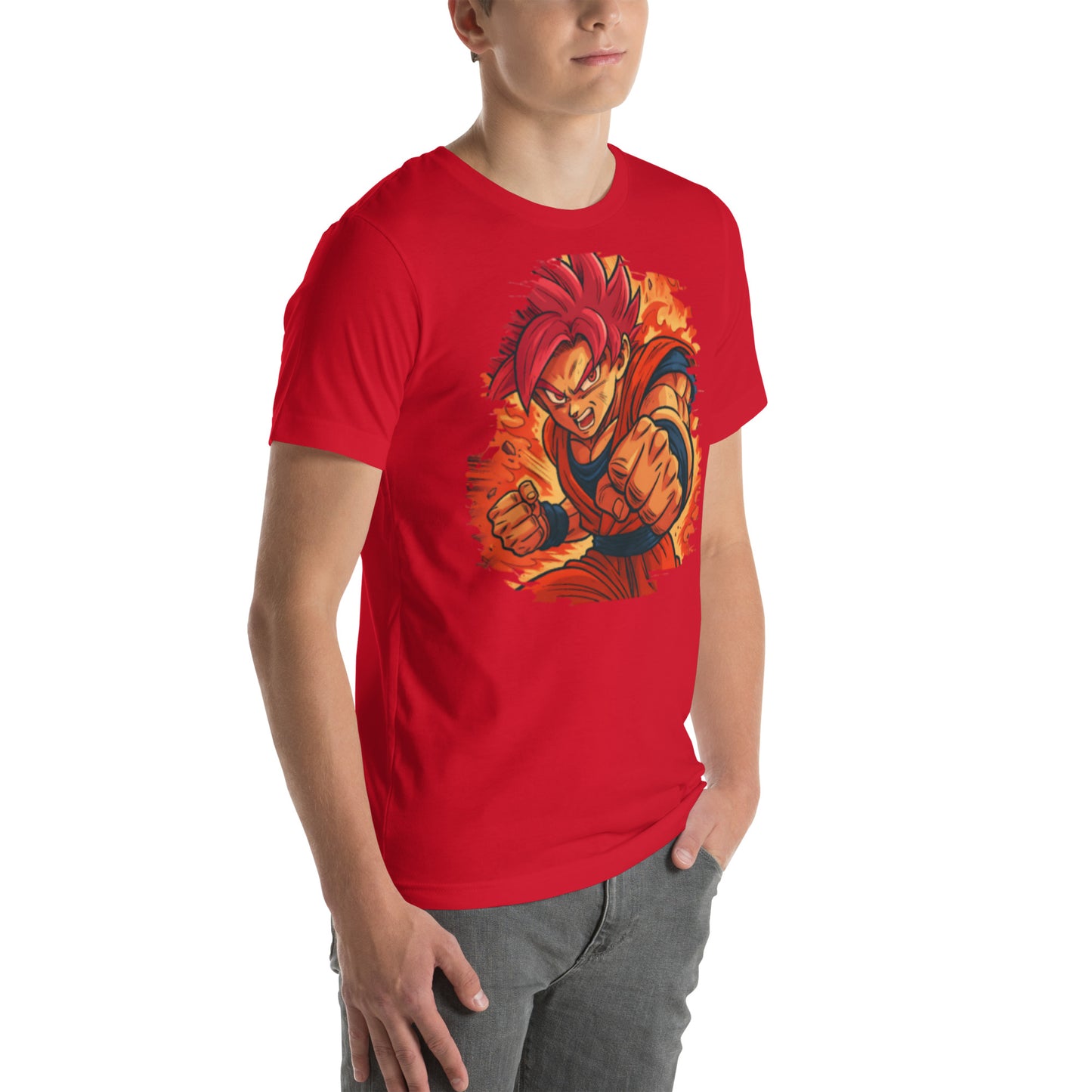 Ignite your fit with Goku in his Super Saiyan God form—fiery red hair, crimson eyes, and a flame-like aura captured in a dynamic, forward-punch pose. This form first appears in Dragon Ball Z: Battle of Gods and is achieved through a special ritual among pure-hearted Saiyans, making it one of the series’ most iconic transformations.