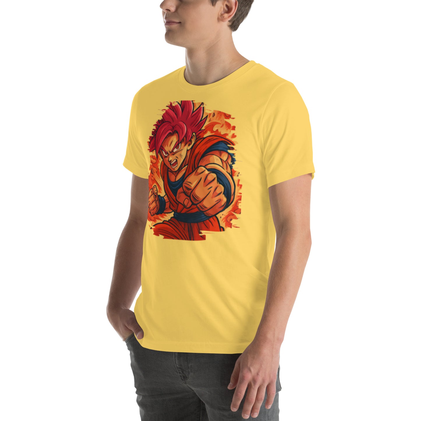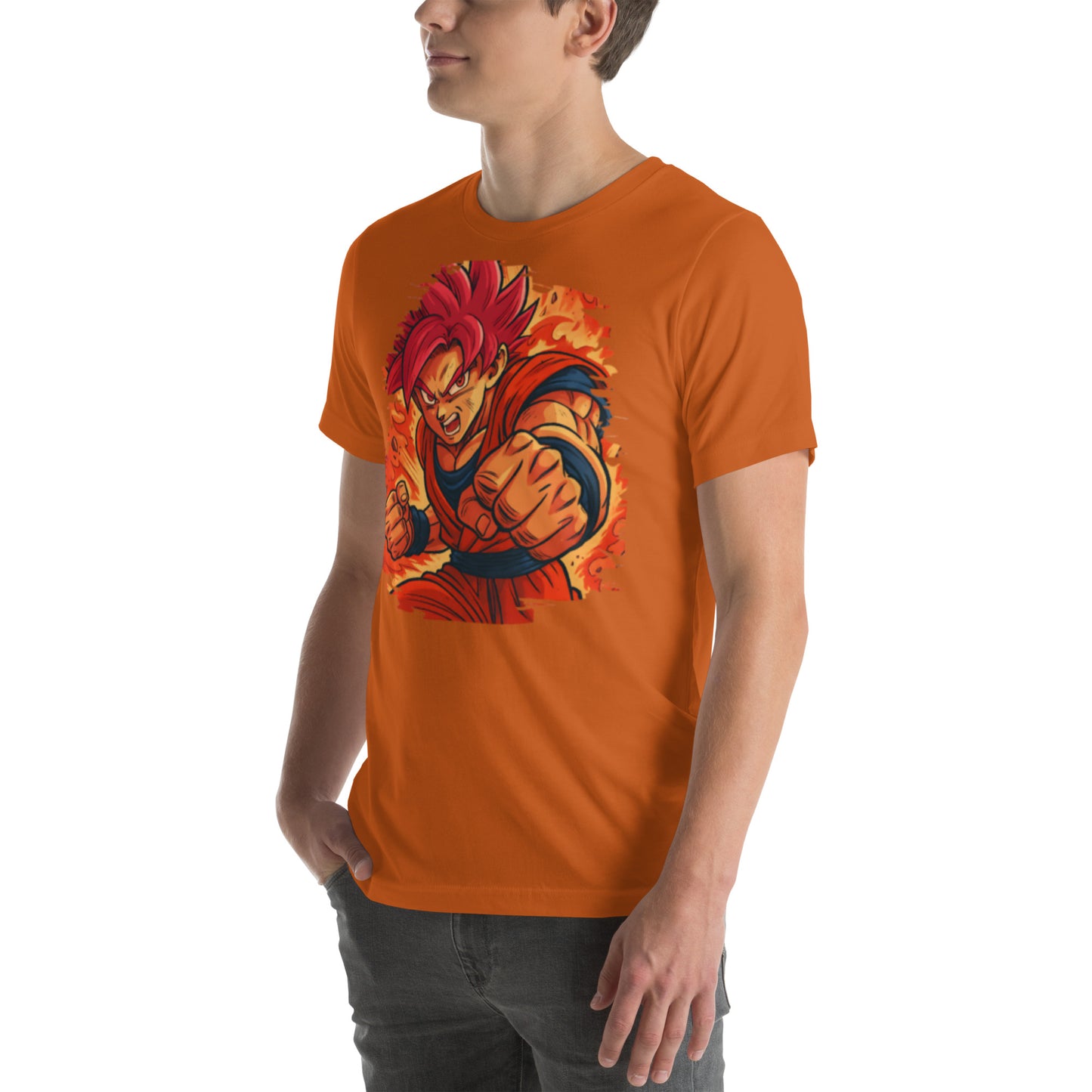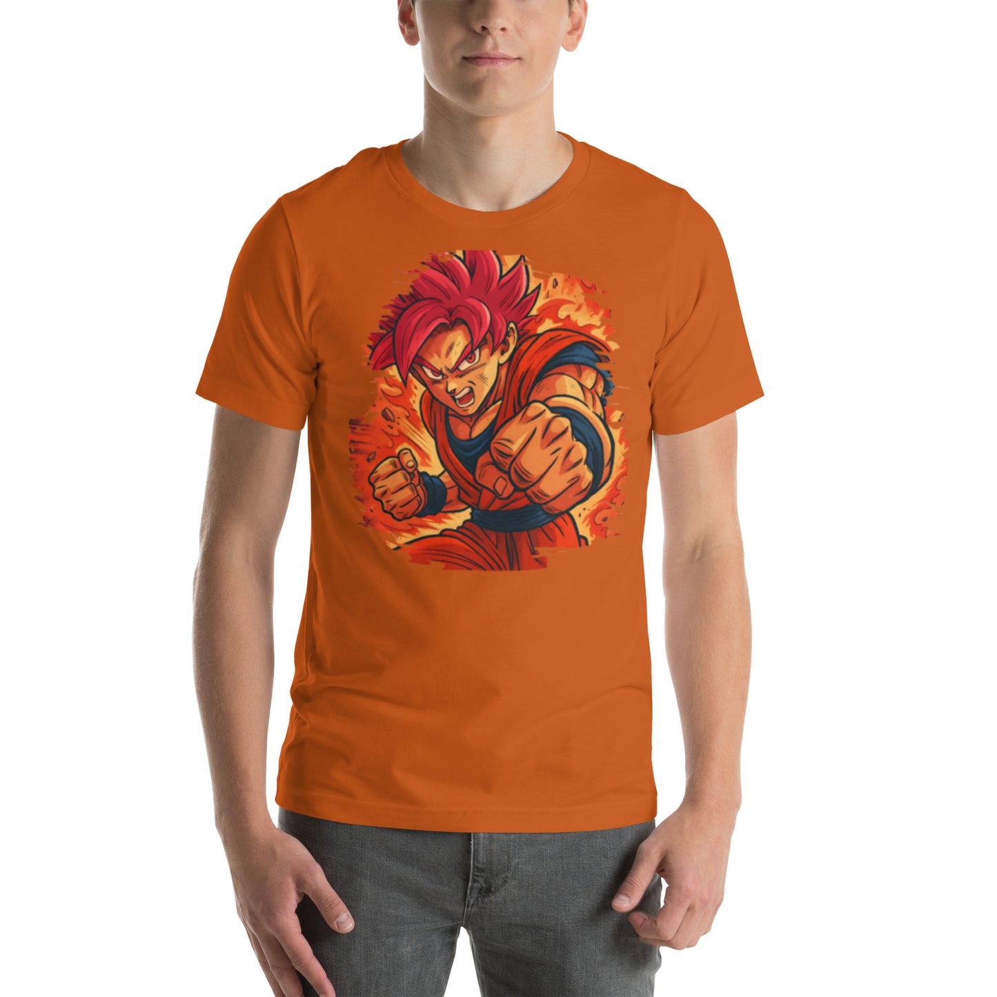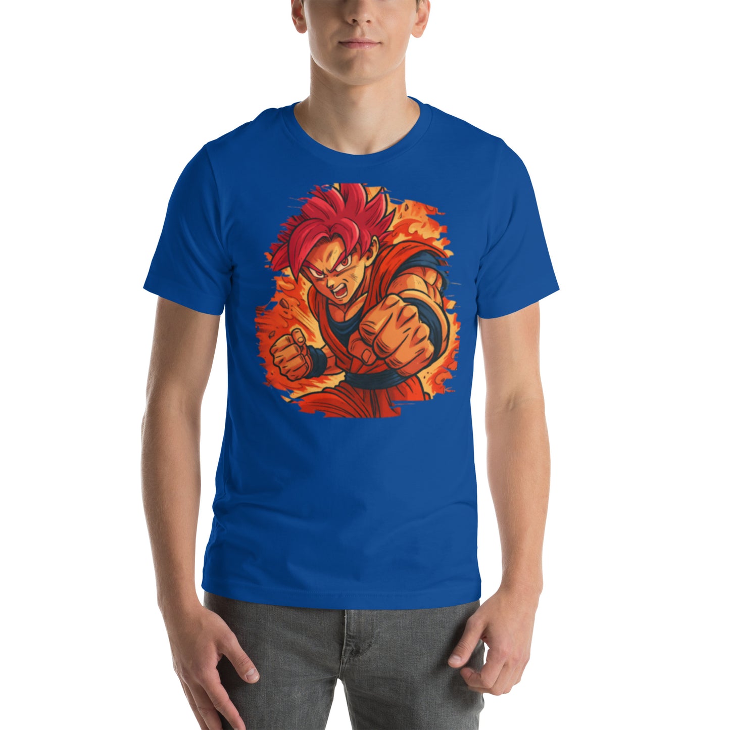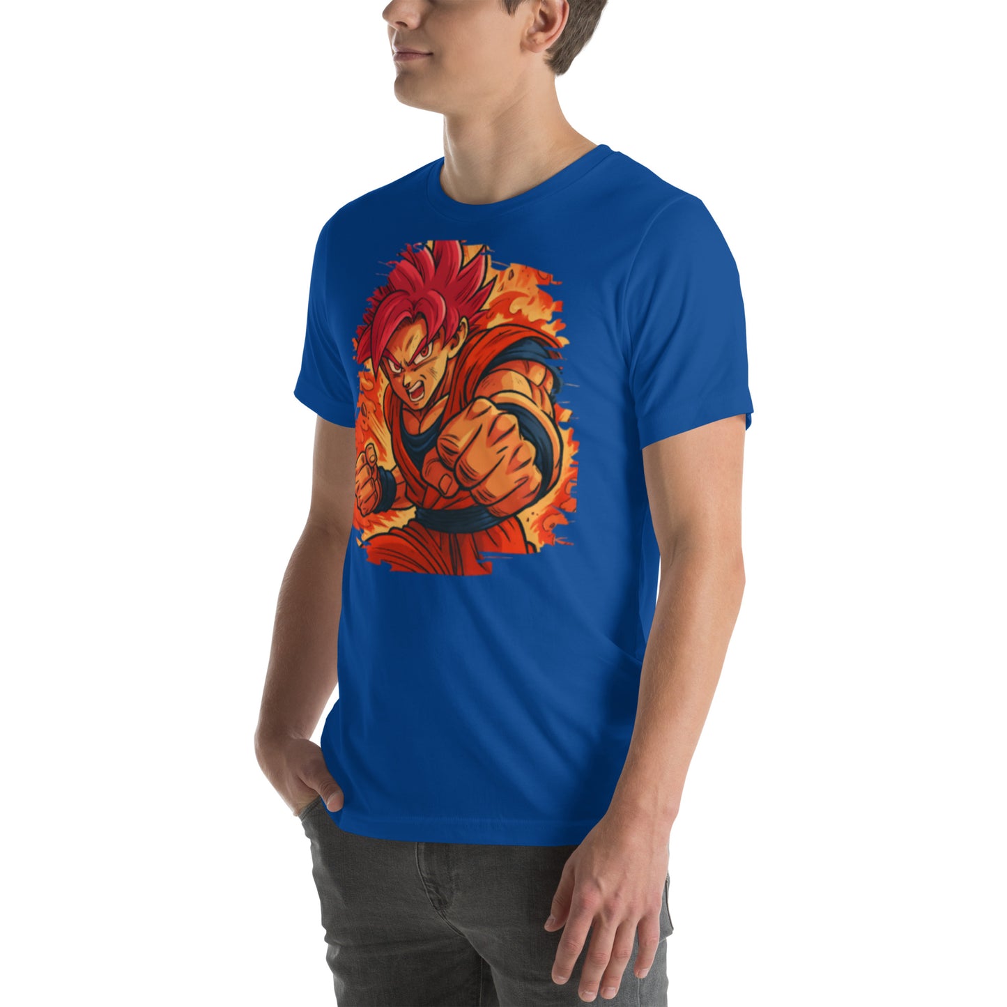 Ignite your fit with Goku in his Super Saiyan God form—fiery red hair, crimson eyes, and a flame-like aura captured in a dynamic, forward-punch pose. This form first appears in Dragon Ball Z: Battle of Gods and is achieved through a special ritual among pure-hearted Saiyans, making it one of the series’ most iconic transformations.