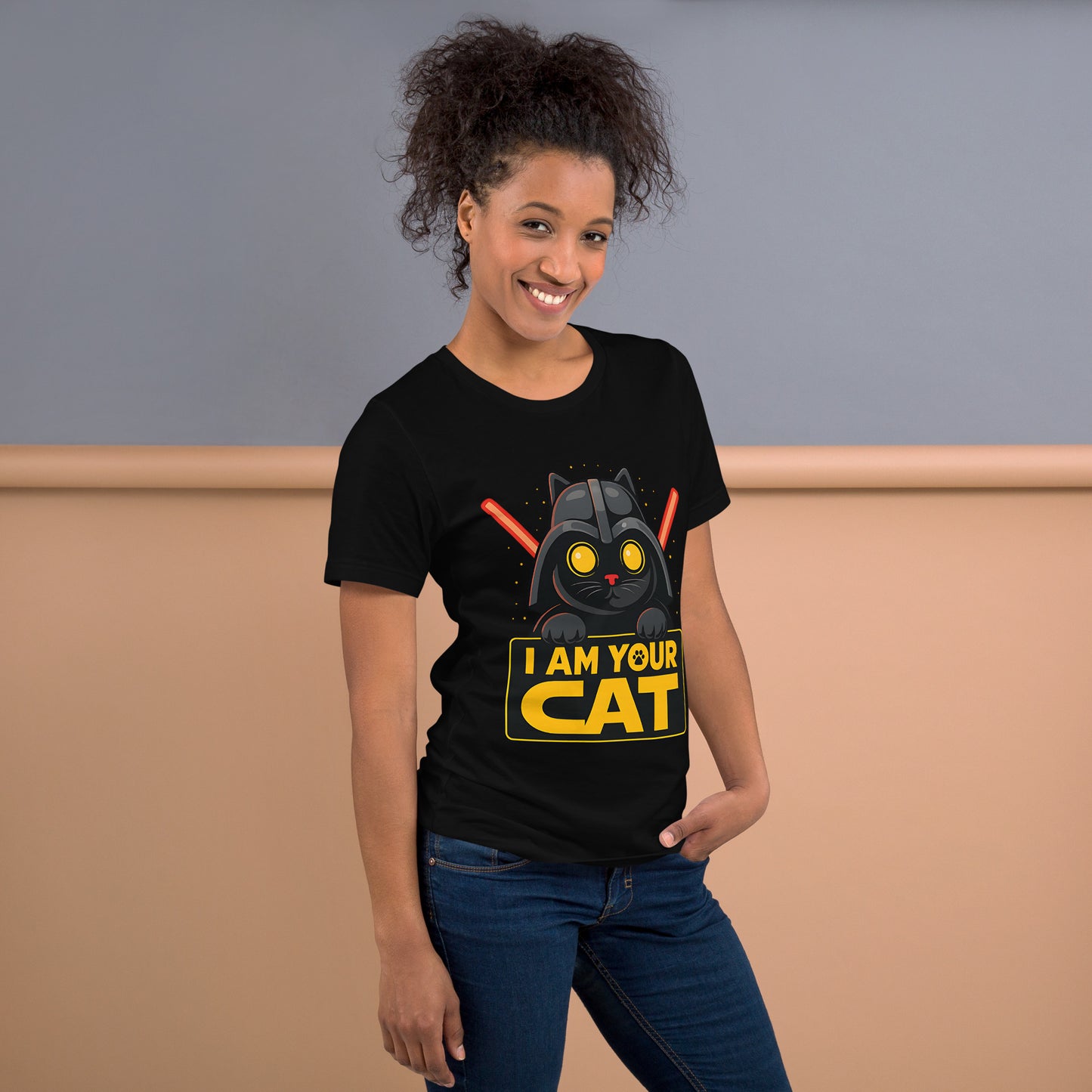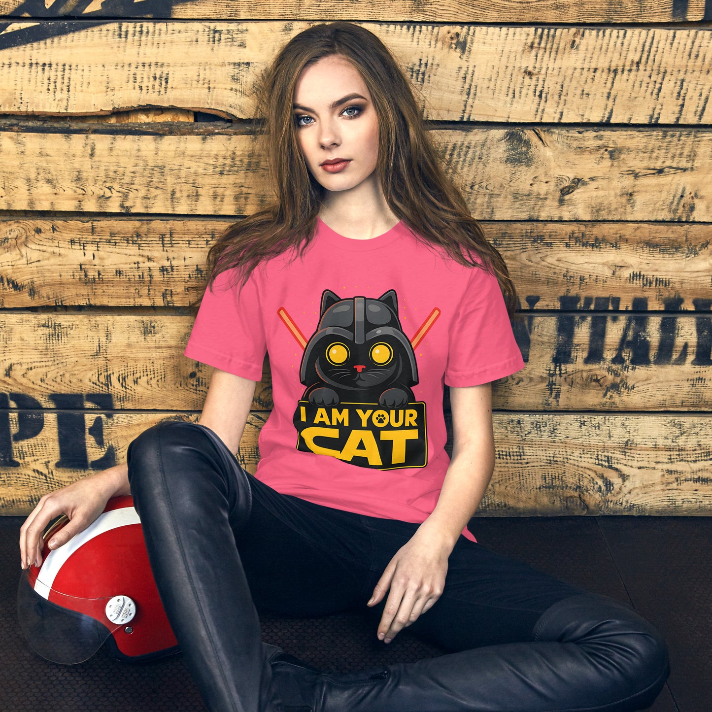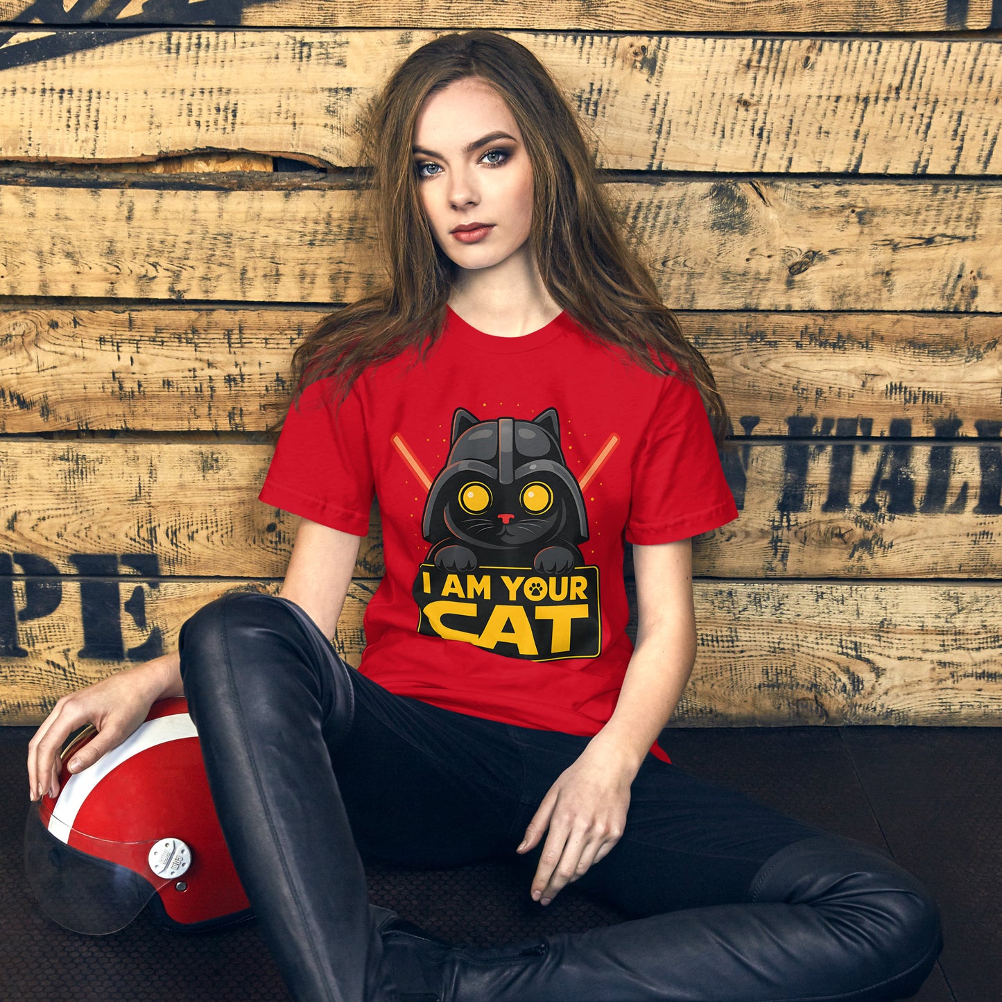 A purr-suasive twist on a cinema classic. This tee features a smug dark-helm-wearing cat with twin red lightsabers and the line “I AM YOUR CAT,” a playful riff on Darth Vader’s famous reveal from The Empire Strikes Back.
