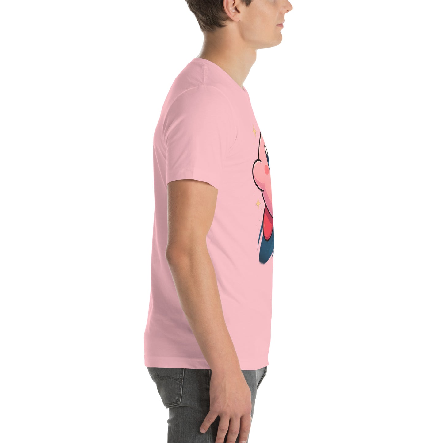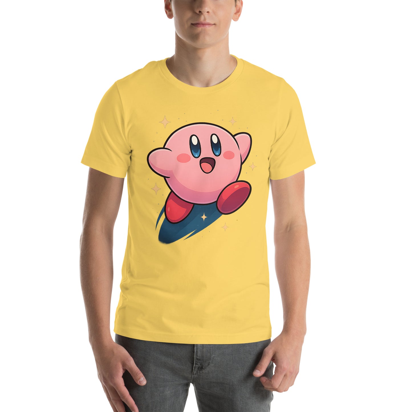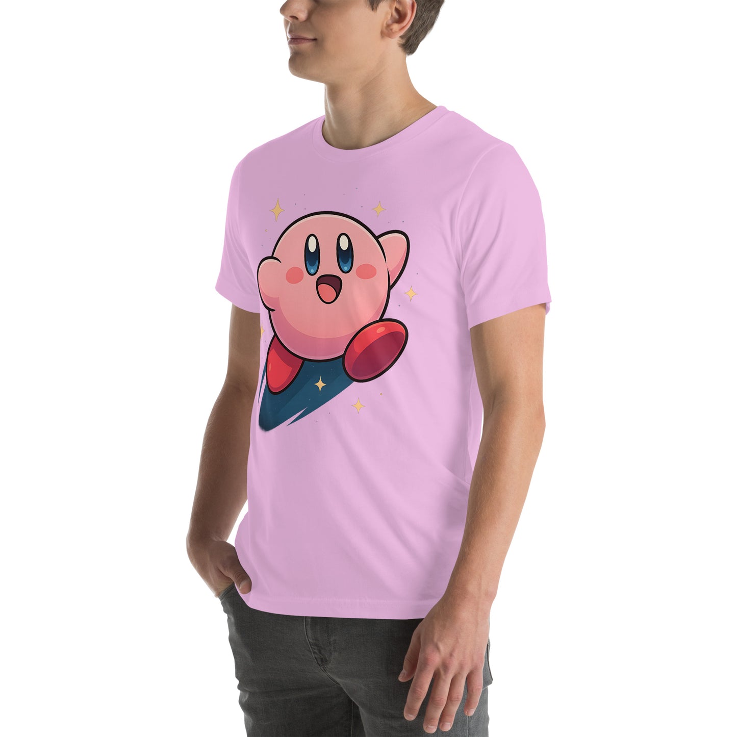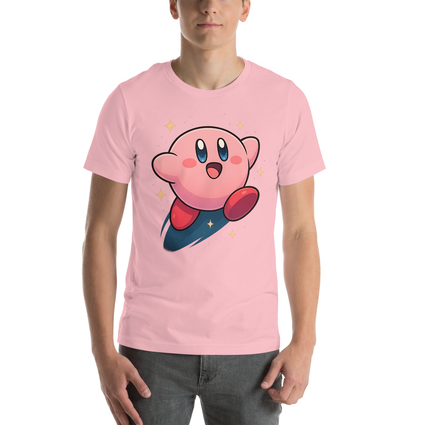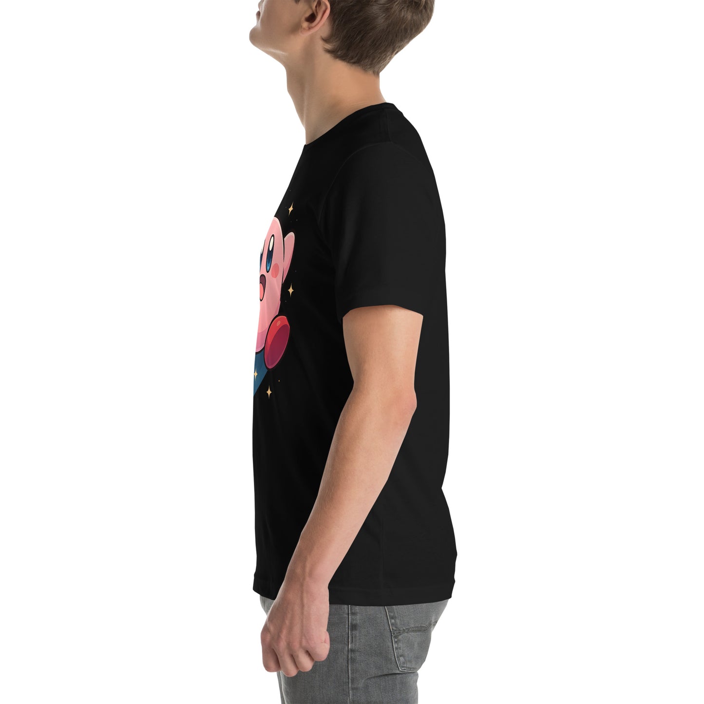 Take a comfy trip to Dream Land with this Kirby graphic tee, featuring the round, rosy-cheeked hero soaring on his iconic Warp Star and surrounded by twinkling stars. It captures Kirby’s classic look—pink, spherical body with red shoes—so fans instantly recognize their favorite Nintendo mascot, while the bold print pops beautifully on a black shirt.